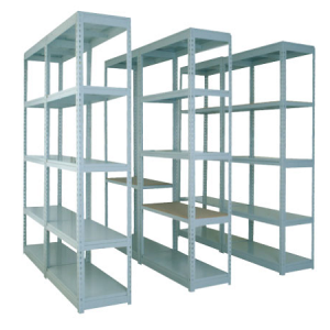 Shelving Rack uses steel Shelves for storing items, with vertical frames and span beams secured using bolts and nuts.